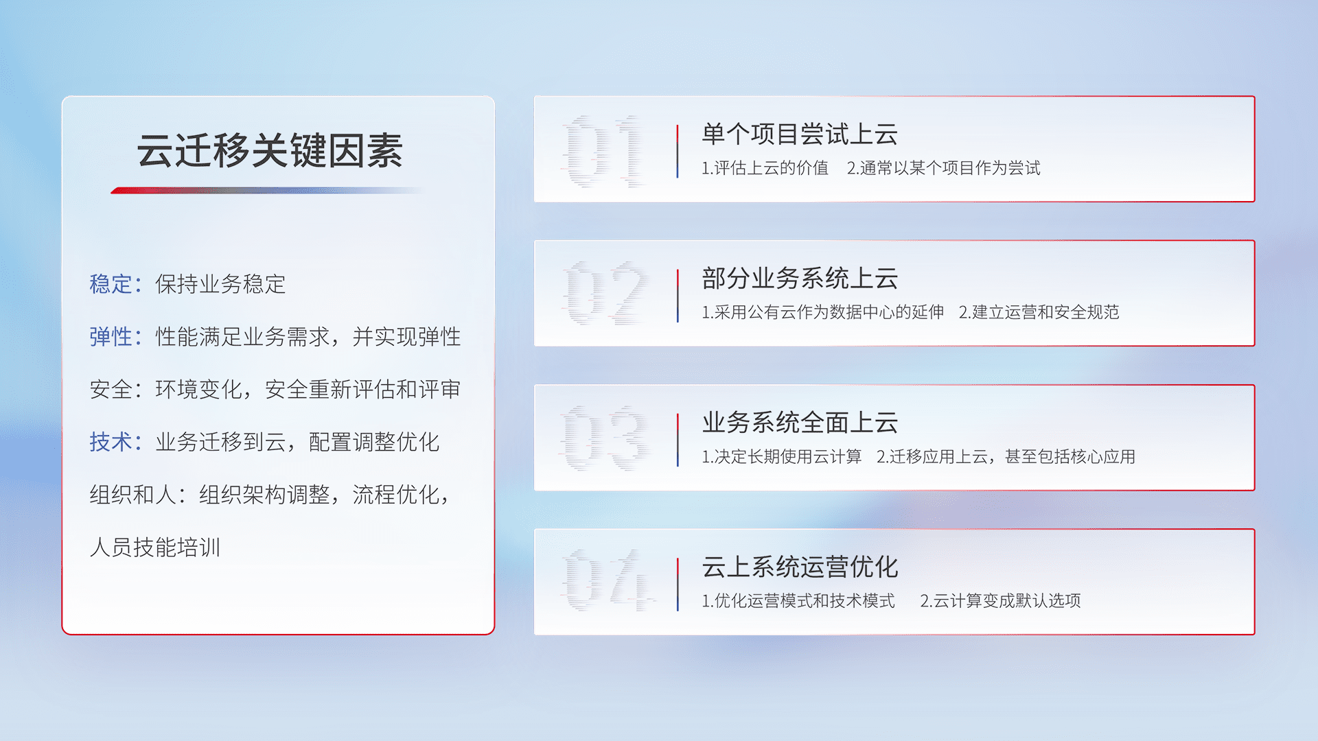 结合实际业务,,,从规划设计、、、云平台选型、、、、云原生改造、、数据迁移、、、集成交付,,,迁移全过程为客户识别最佳上云路径,,,做好风险识别管理,,,,设计网络架构、、、、身份权限、、、安全审计合规、、、操作审计、、、日志审计、、监控告警策略、、多站点容灾设计等,,,对云上基础设施进行整体规划,,,提升IT治理水平,,,以满足弹性、、、、高可用、、、高性能的需求。。。。