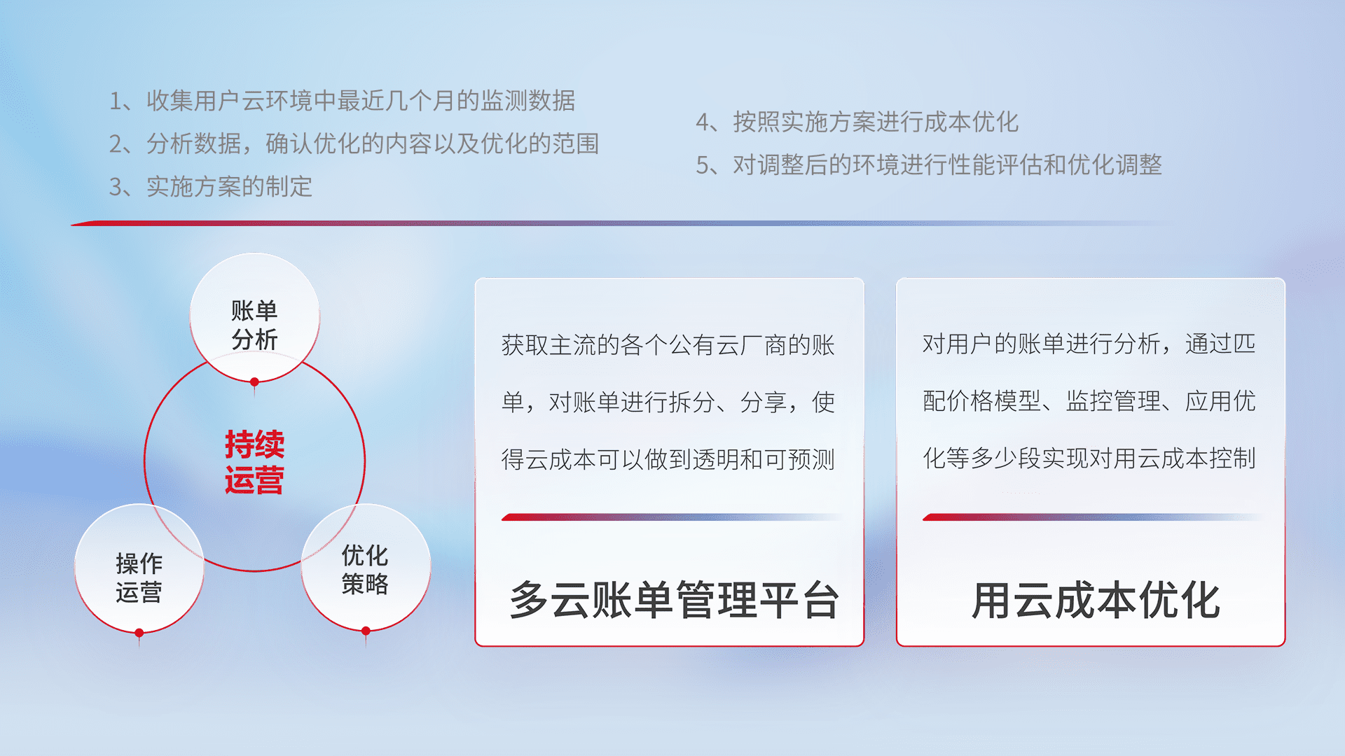 通过多云纳管,,,,以统一的资源数据模型把客户的云资源进行抽象和封装,,进而实现对多云资源的统一操作,,保障云资源管理的可靠性、、稳定性与可用性。。量身定制化运维内容,,,配置、、、、开发运维、、、补丁管理、、、备份、、、监控、、、、认证和访问管理、、审计和日常巡检等,,,保障在用云过程中的可靠度,,,,稳定度以及高可用率。。。
